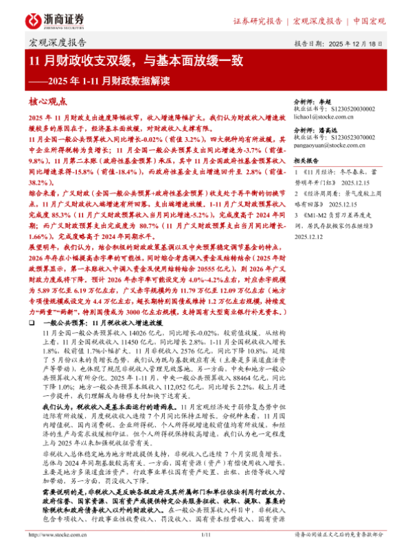 【浙商证券】【202512】11月财政收支双缓,与基本面放缓一致——2025年 1-11月财政数据解读-11页 证券期货研究报告