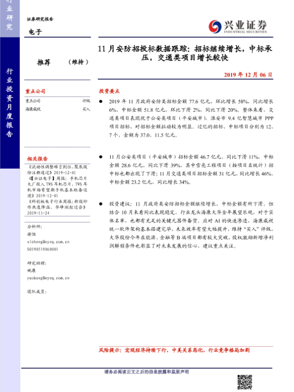【兴业证券】【20191206】11月安防招投标数据跟踪:招标继续增长,中标承压,交通类项目增长较快-5页 行业研究