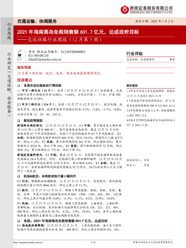 【浙商证券】【20220102】2021年海南离岛免税销售额601.7亿元,达成政府目标-19页 行业研究