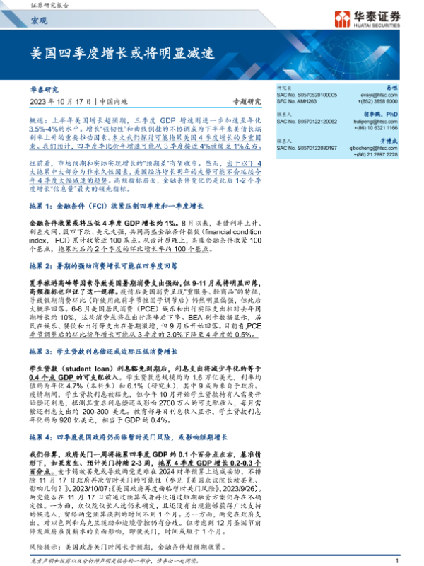 【华泰证券】【20231017】宏观专题研究:美国四季度增长或将明显减速-16页 宏观策略