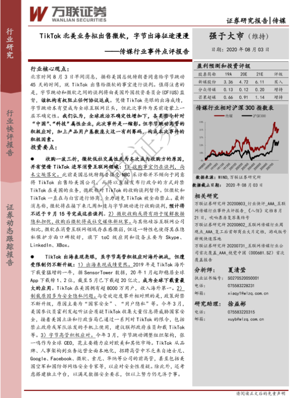 【万联证券】【20200803】20200803-万联证券-传媒行业事件点评报告:TikTok北美业务拟出售微软,字节出海征途漫漫-4页 行业研究