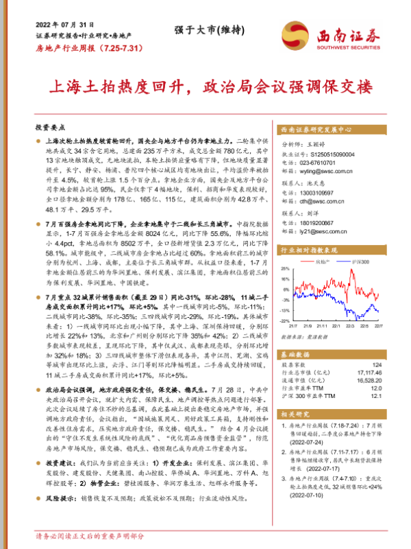 【西南证券】【20220731】房地产行业周报:上海土拍热度回升,政治局会议强调保交楼-14页 行业研究