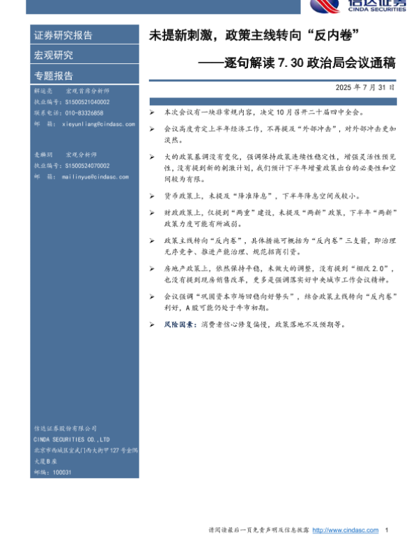 【信达证券】【202507】未提新刺激,政策主线转向“反内卷”——逐句解读 7.30政治局会议通稿-10页 会议纪要