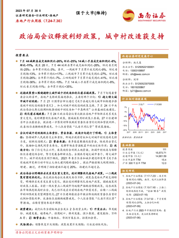 【西南证券】【20230730】房地产行业周报:政治局会议释放利好政策,城中村改造获支持-17页 行业研究