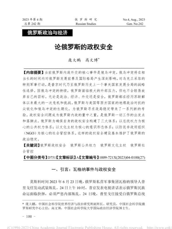 【中国社会科学院】【2023】论俄罗斯的政权安全-27页 学术论文