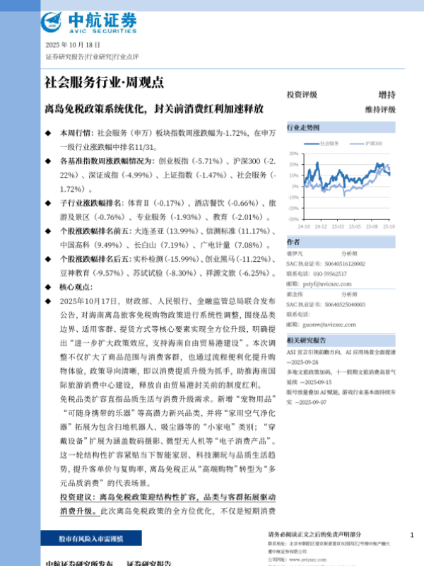 【中航证券】【202510】社会服务行业·周观点:离岛免税政策系统优化,封关前消费红利加速释放-9页 证券期货研究报告