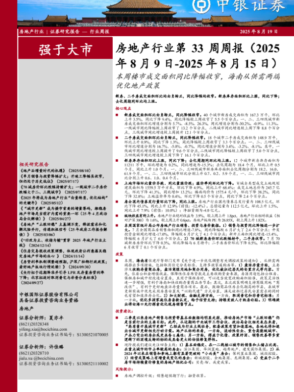 【中银证券】【20250819】房地产行业第33周周报-本周楼市成交面积同比降幅收窄,海南从供需两端优化地产政策-25页 证券期货研究报告