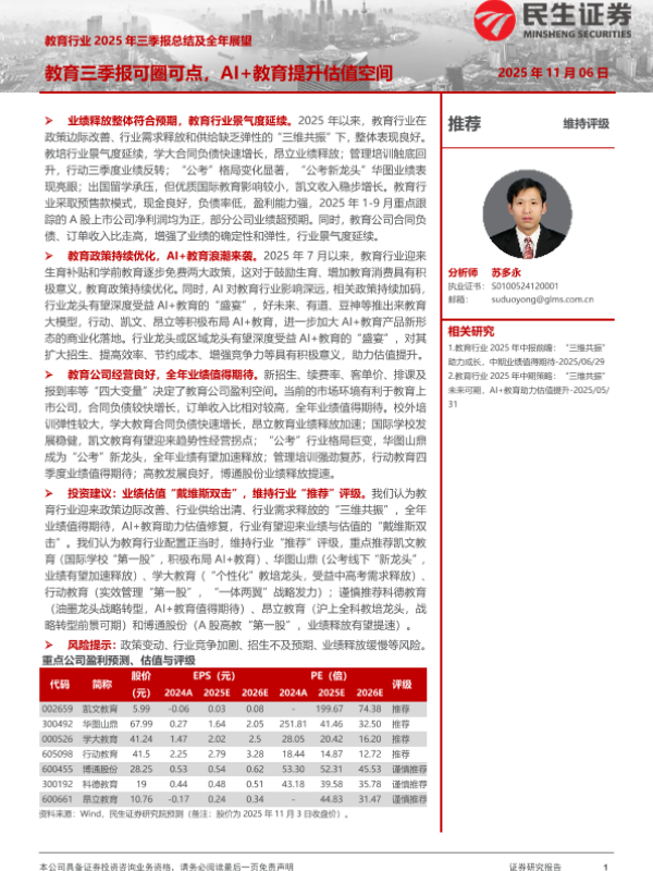 【民生证券】【202511】教育行业2025年三季报总结及全年展望:教育三季报可圈可点,AI+教育提升估值空间-23页 证券期货研究报告