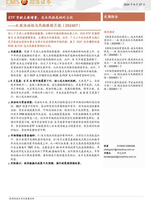 【海通证券】【20240627】A股流动性与风格跟踪月报:ETF贡献主要增量,龙头风格或相对占优-19页 行业研究