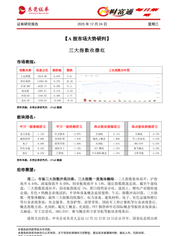 【东莞证券】【202512】2025年12月24日 A股市场大势研判:三大指数收微红-4页 证券期货研究报告