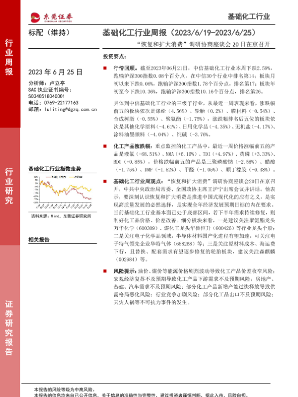 【东莞证券】【20230625】基础化工行业周报:“恢复和扩大消费”调研协商座谈会20日在京召开-10页 行业研究