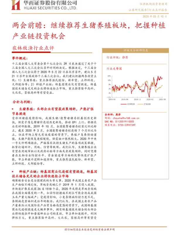 【华西证券】【20200510】20200510-华西证券-农林牧渔行业点评:两会前瞻:继续推荐生猪养殖板块,把握种植产业链投资机会-11页 行业研究