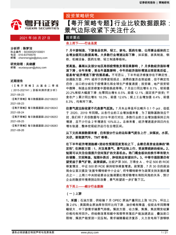 【粤开证券】【20210827】行业比较数据跟踪:景气边际收紧下关注什么-21页 行业研究