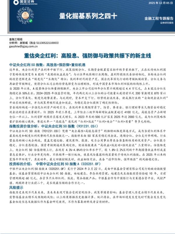 【国金证券】【2025】中证央企红利 50指数:高股息+强防御+重估机遇-18页 证券期货研究报告