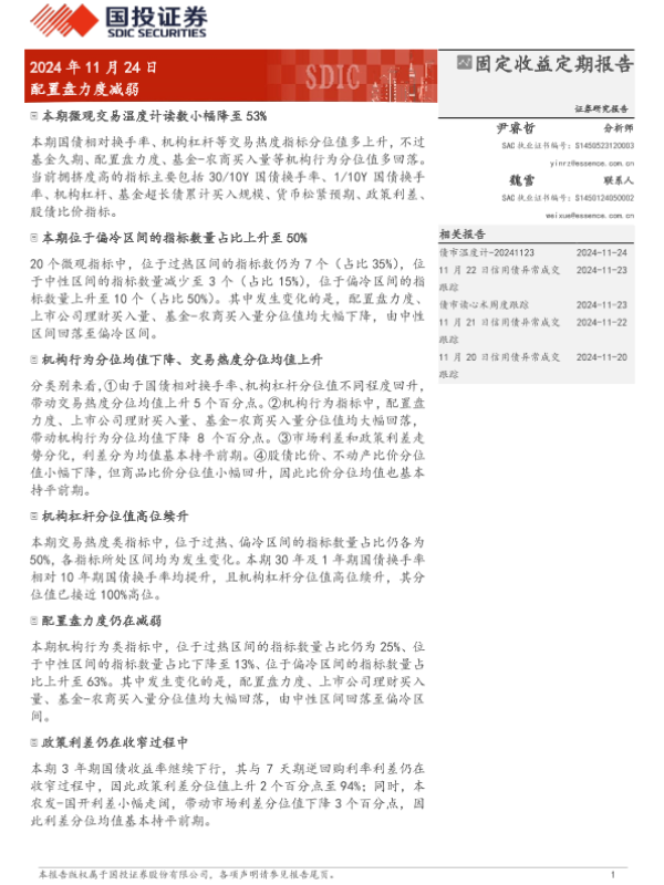 【国投证券】【20241124】固定收益定期报告:配置盘力度减弱-10页 行业研究