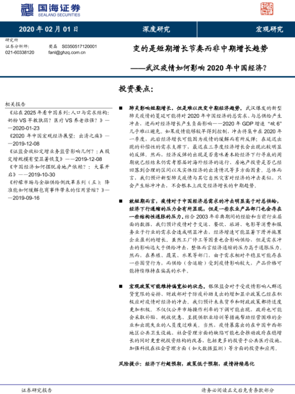 【国海证券】【20200201】变的是短期增长节奏而非中期增长趋势——武汉疫情如何影响2020年中国经济?-12页 行业研究