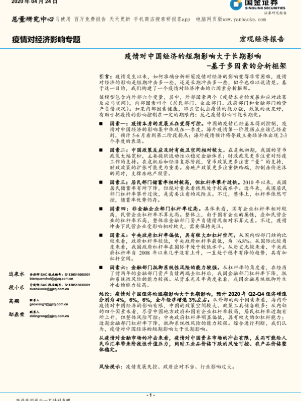【国金证券】【20200424】疫情对经济影响专题:基于多因素的分析框架,疫情对中国经济的短期影响大于长期影响-23页 宏观策略
