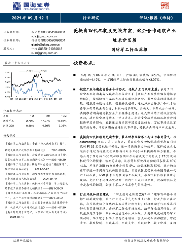 【国海证券】【20210912】20210912-国海证券-国防军工行业周报:美提出四代机航发更换方案,政企合作通航产业迎来新发展-11页 行业研究