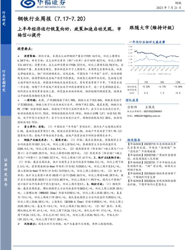 【华福证券】【20230721】20230721-华福证券-钢铁行业周报:上半年经济运行恢复向好,政策加速启动兑现,市场信心提升-15页 行业研究