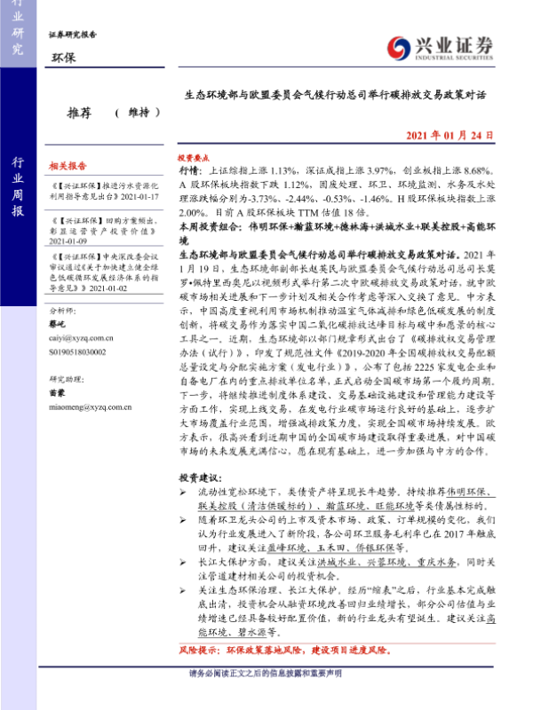 【兴业证券】【20210124】生态环境部与欧盟委员会气候行动总司举行碳排放交易政策对话-8页 行业研究
