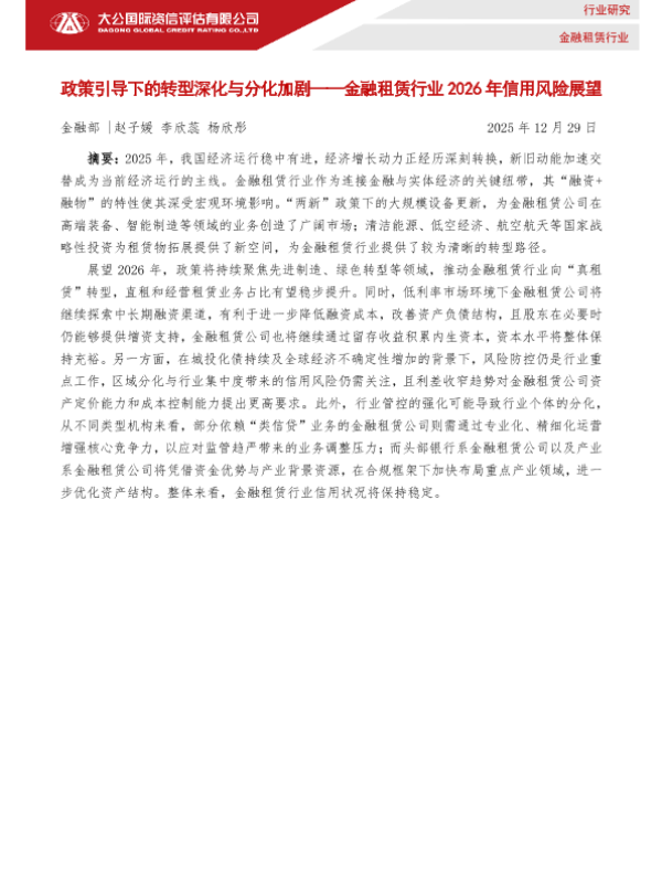 【大公国际】【202512】政策引导下的转型深化与分化加剧——金融租赁行业2026年信用风险展望-11页 行业研究