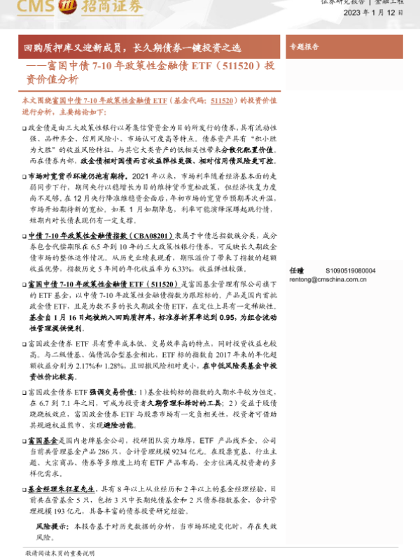 【海通证券】【20230112】富国中债7-10年政策性金融债ETF(511520)投资价值分析:回购质押库又迎新成员,长久期债券一键投资之选-18页 行业研究