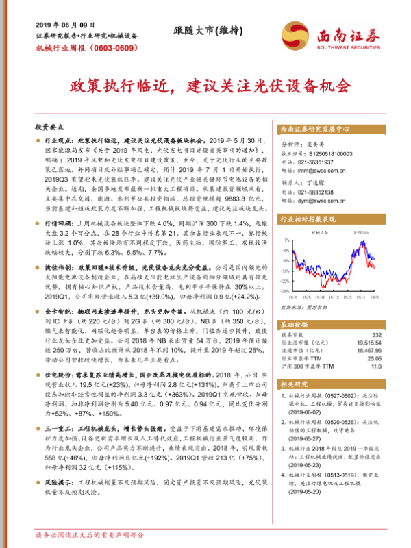 【西南证券】【20190609】20190609-西南证券-机械设备行业周报:政策执行临近,建议关注光伏设备机会-10页 行业研究