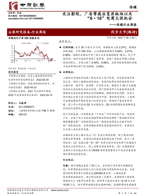 【中原证券】【20220606】传媒行业周报:关注影院、广告等疫后复苏板块以及“6·18”电商大促机会-14页 行业研究