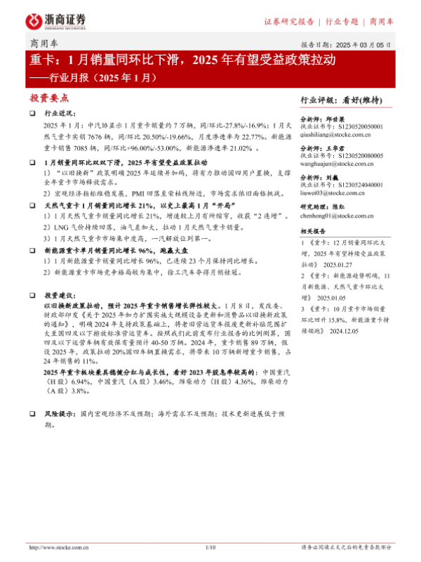 【浙商证券】【20250305】商用车行业月报(2025年1月):重卡:1月销量同环比下滑,2025年有望受益政策拉动-10页 行业研究