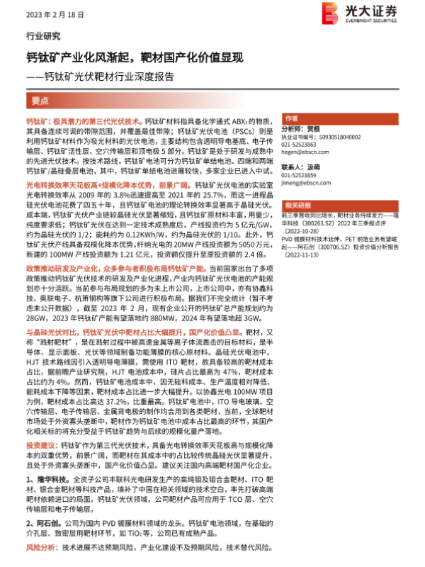 【光大证券】【20230218】钙钛矿产业化风渐起,靶材国产化价值显现-23页 行业研究