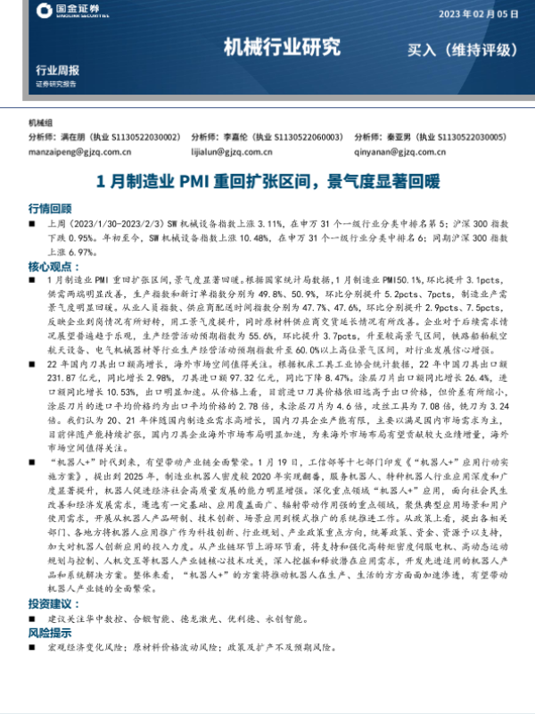 【国金证券】【20230205】20230205-国金证券-机械行业周报:1月制造业PMI重回扩张区间,景气度显著回暖-17页 行业研究