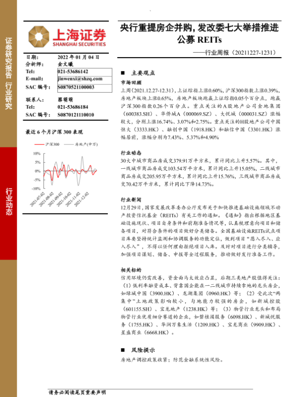 【上海证券】【20220104】房地产行业周报:央行重提房企并购,发改委七大举措推进公募REITs-13页 行业研究