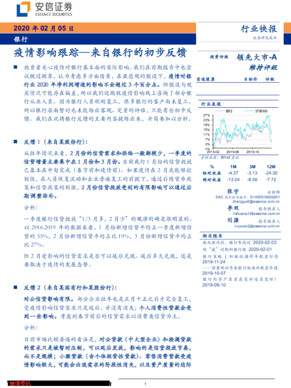 【安信证券】【20200205】银行行业快报:疫情影响跟踪—来自银行的初步反馈-6页 行业研究