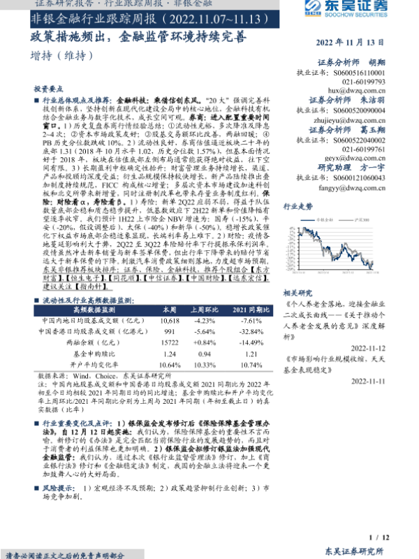 【东吴证券】【20221113】非银金融行业跟踪周报:政策措施频出,金融监管环境持续完善-12页 行业研究