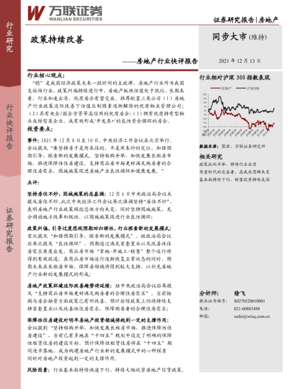 【万联证券】【20211213】房地产行业快评报告:政策持续改善-2页 行业研究
