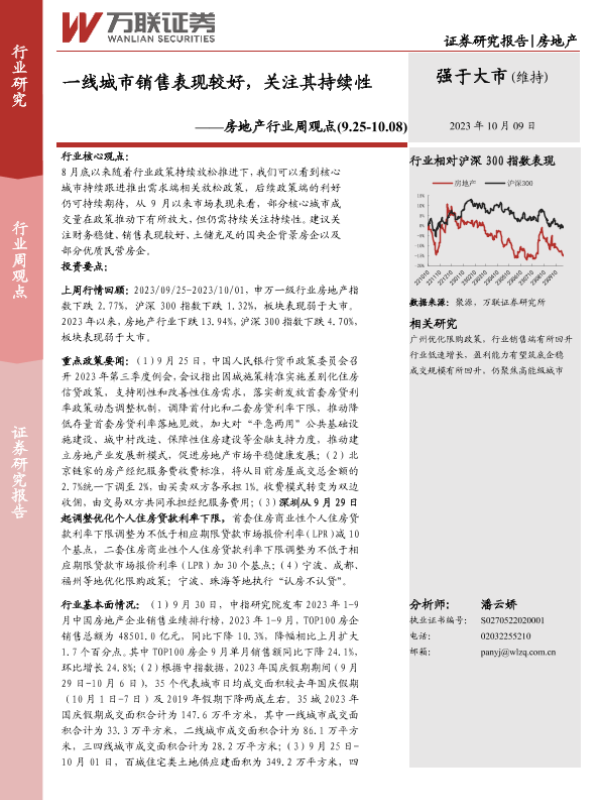 【万联证券】【20231009】一线城市销售表现较好,关注其持续性-17页 行业研究