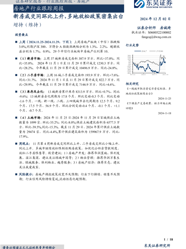 【东吴证券】【20241202】房地产行业跟踪周报:新房成交同环比上升,多地放松政策密集出台-18页 行业研究