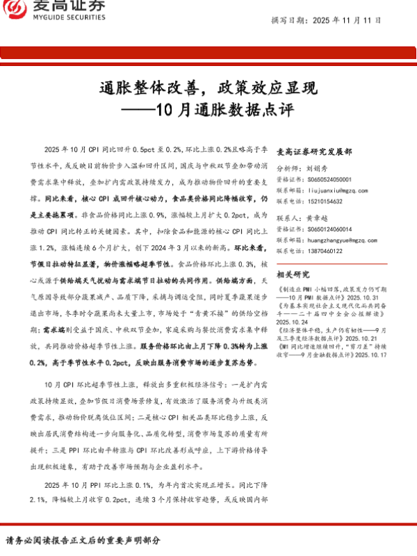 【麦高证券】【202511】通胀整体改善,政策效应显现 ——10月通胀数据点评-10页 证券期货研究报告