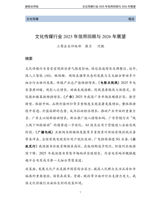 【新世纪评级】【2025】新世纪评级 文化传媒行业 2025年信用回顾与 2026年展望-40页 行业研究