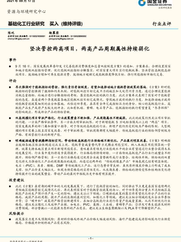 【国金证券】【20210917】基础化工行业:坚决管控两高项目,两高产品周期属性持续弱化-3页 行业研究