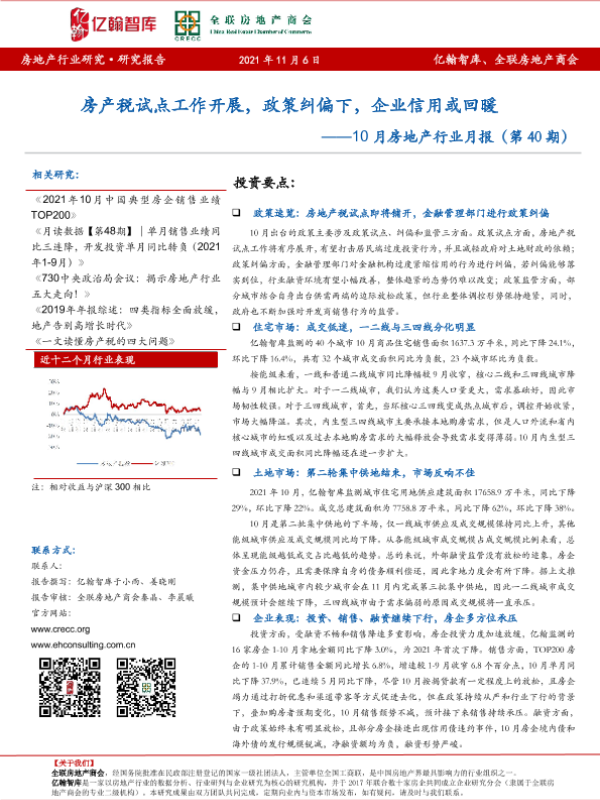 【亿翰智库】【20211106】10月房地产行业月报:房产税试点工作开展,政策纠偏下,企业信用或回暖-26页 行业研究