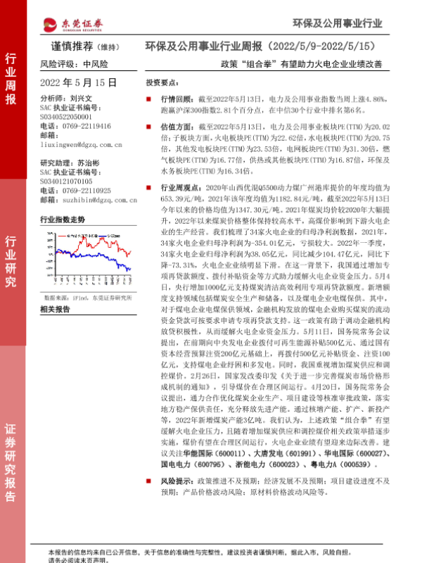 【东莞证券】【20220515】环保及公用事业行业周报:政策“组合拳”有望助力火电企业业绩改善-11页 行业研究