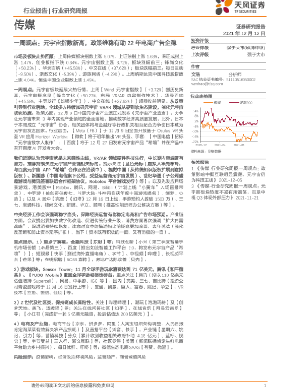 【天风证券】【20211212】传媒一周观点:元宇宙指数新高,政策维稳有助22年电商广告企稳-15页 行业研究