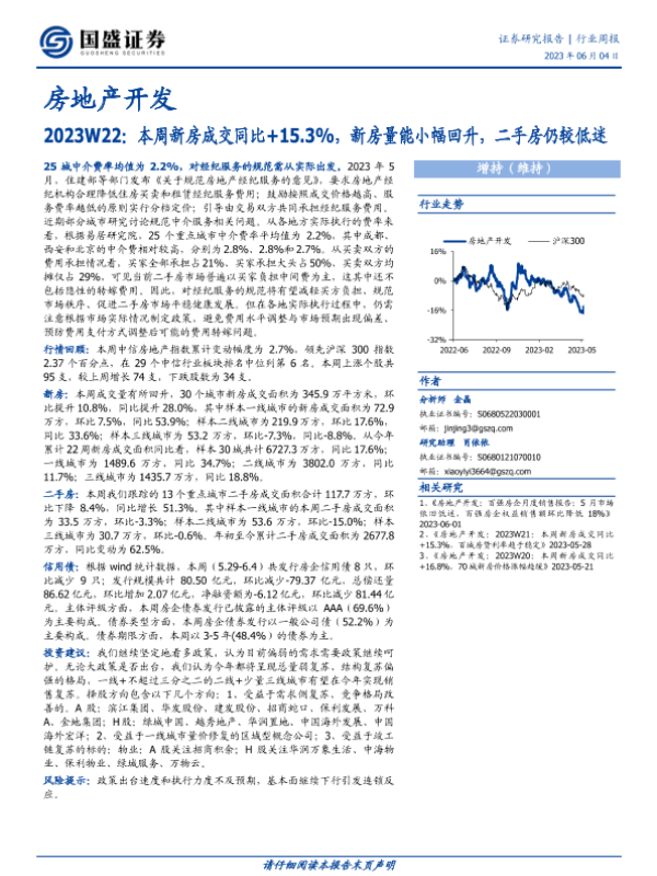 【国盛证券】【20230604】房地产开发2023W22:本周新房成交同比+15.3%,新房量能小幅回升,二手房仍较低迷-13页 行业研究