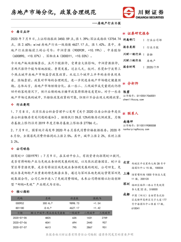 【川财证券】【20200709】房地产行业日报:房地产市场分化,政策合理规范-3页 证券期货研究报告