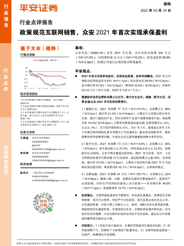 【平安证券】【20220324】政策规范互联网销售,众安2021年首次实现承保盈利-2页 行业研究