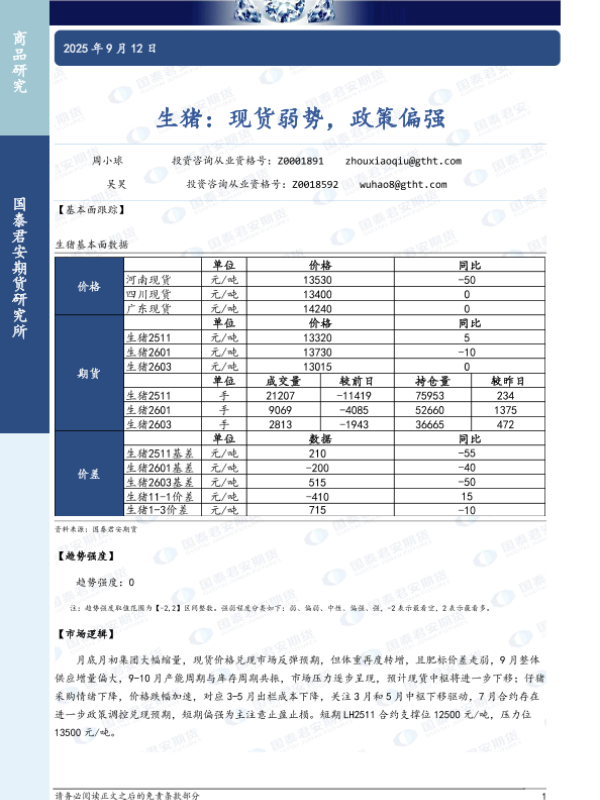 【国泰君安期货】【202509】生猪:现货弱势,政策偏强-2页 证券期货研究报告