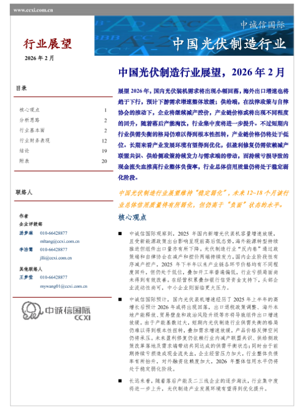 【中诚信国际CCXI】【202602】中国光伏制造行业展望,2026年 2月-23页 行业研究