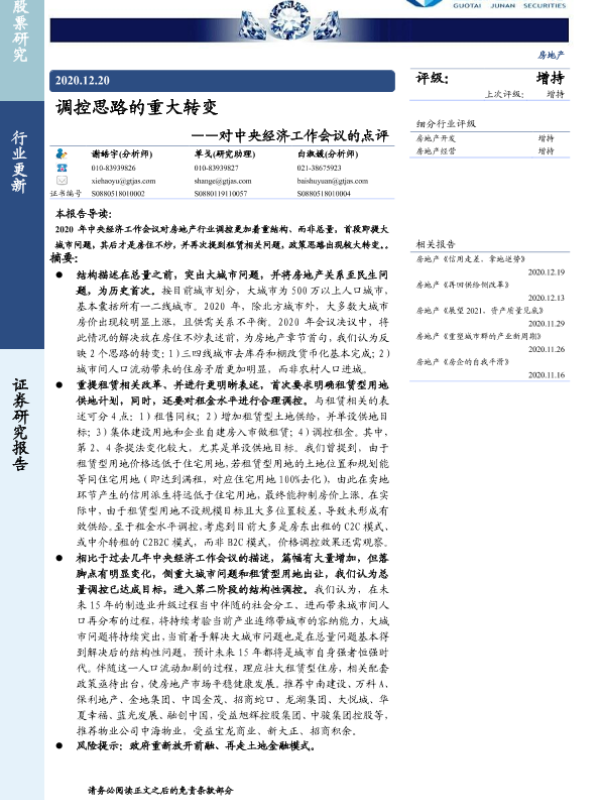 【国泰君安证券】【20201220】调控思路的重大转变——对中央经济工作会议的点评-3页 行业研究