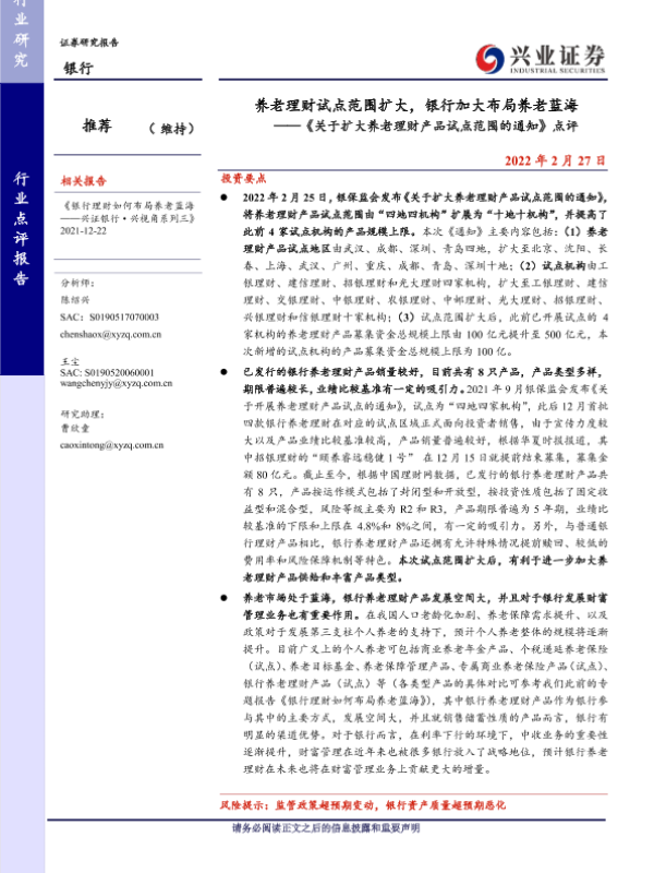 【兴业证券】【20220227】关于扩大养老理财产品试点范围的通知点评:养老理财试点范围扩大,银行加大布局养老蓝海-5页 行业研究